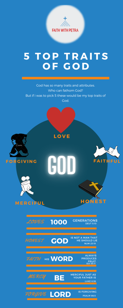 5 Traits I Love About God Posted byPetra ATSeptember 15, 2020September 15, 2020Posted inUncategorized AudioTranscript PDFDownload 5 Tops Traits of God Signing off Share this: Click to share on X (Opens in new window) X Click to share on Facebook (Opens in new window) Facebook Like Loading... Related